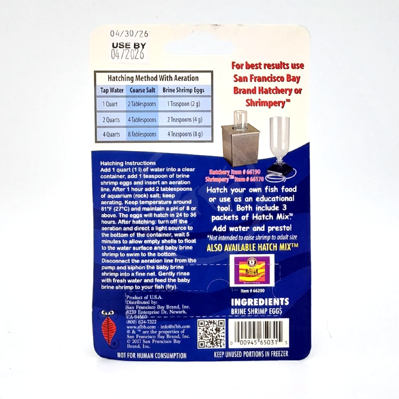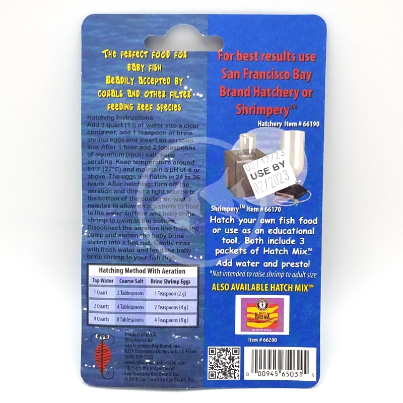 San Francisco Bay Brine Shrimp Eggs. Freshly hatched brine shrimp are an excellent food for baby fish, small fish and reef tanks. San Francisco Bay Brand® has supplied brine shrimp eggs for the ornamental fish industry for over forty years.