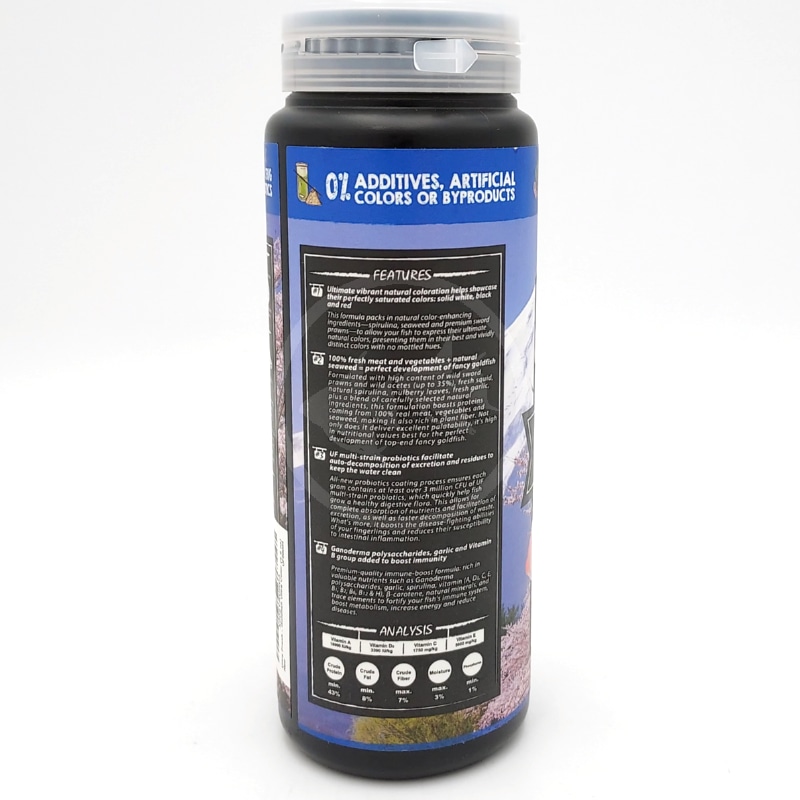 Formulated with high content of wild sword prawns and wild Akiami paste shrimps (up to 35%), fresh squid, natural spirulina, fresh-pick sweet potato leaves, mulberry leaves, fresh garlic, plus a blend of carefully selected natural ingredients, this formulation boasts proteins coming from 100% real meat, vegetables and seaweed, making it also rich in plant fiber. Not only does it deliver excellent palatability, it’s high in nutritional values best for the perfect development of top-end fancy goldfish.