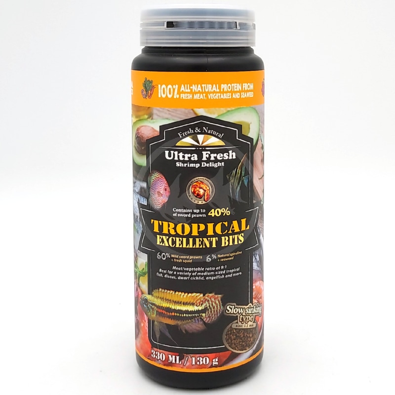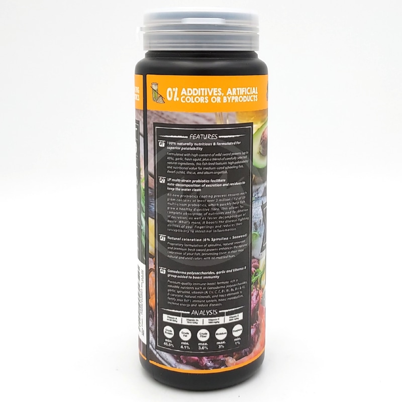 Formulated with high content of wild sword prawns (up to 40%), garlic, fresh squid, plus a blend of carefully selected natural ingredients, this fish feed features high palatability and nutritional value for medium-sized schooling fish, dwarf cichlid, discus, and altum angelfish.