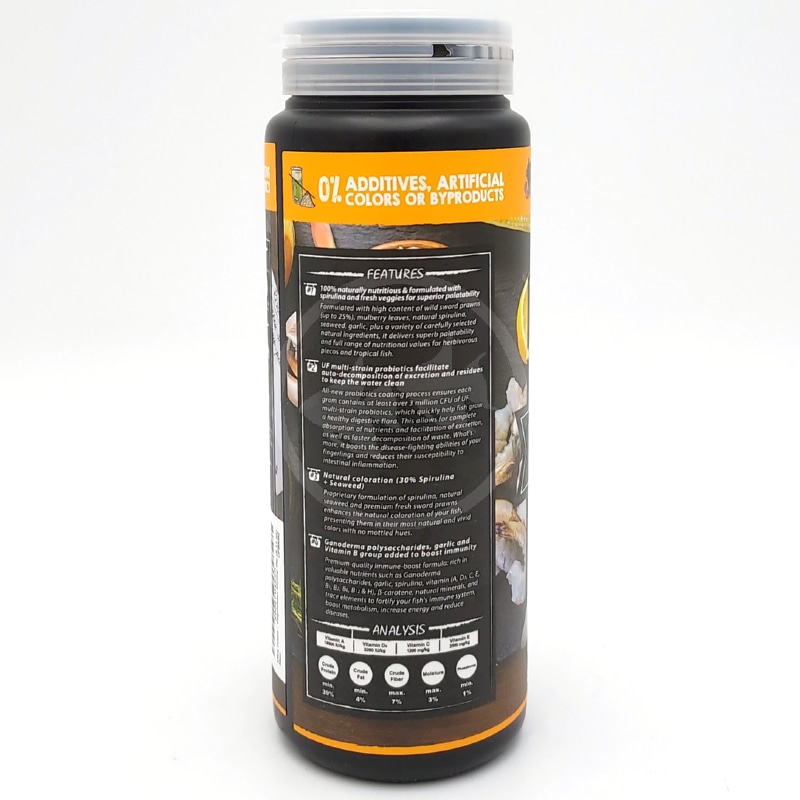 Formulated with high content of wild sword prawns (up to 25%), with fresh-pick sweet potato leaves, mulberry leaves, natural spirulina, seaweed, garlic, plus a variety of carefully selected natural ingredients, it delivers superb palatability and full range of nutritional values for herbivorous plecos and tropical fish.