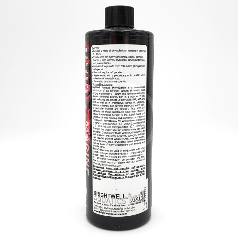 Brightwell Aquatics PhytōChrōm is a concentrated suspension of six different species of marine algae ranging in size from 1 – 30µm and having an extremely diverse nutritional profile, rich in a number of fatty acids including the omega-3 fatty acids EPA, ARA, and DHA, as well as in chlorophyll, carotenoid pigments, vitamins, minerals, and several important amino acids. Of particular interest are omega-3 fatty acids and pigments, for these substances have been shown to provide tremendous benefit to the overall health and coloration of filter feeding and planktivorous organisms.