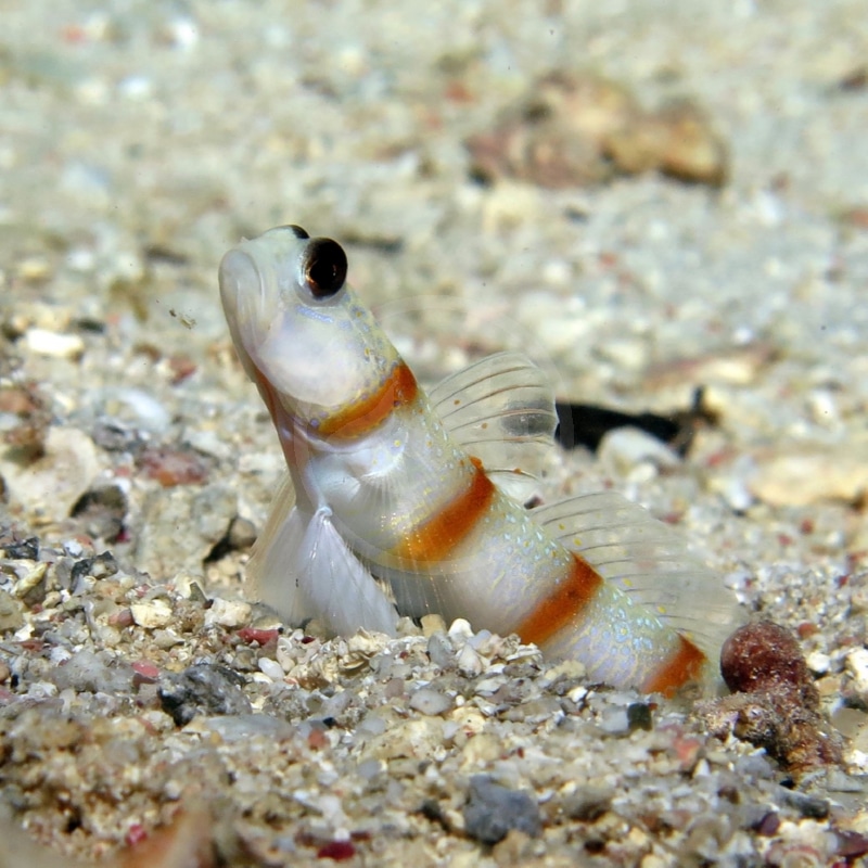 General Description: The Steinitz Goby are found in rubble zones of reefs or sandy lagoons of the Indo-Pacific region. A peaceful goby with unparalleled personality to match, the Steinitz goby has white body with five wide, dull brown vertical bands across its body and tiny blue dots, namely in its face. Not to be confused with the Wheeler’s Watchman Goby (Amblyeleotris wheeleri), which has six burgundy-red and slanted vertical bands. This goby can form a symbiotic relationship with pistol shrimp, typically those in the genus Alpheus, in which the shrimp maintains the burrow they live in and the goby alerts the nearly blind shrimp of potential threats. A Steinitz goby can reach an adult size of approximately 3″.