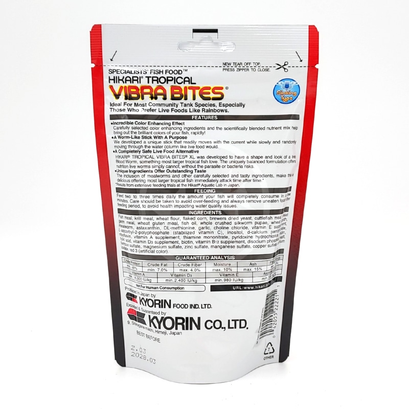 Hikari Vibra Bites, another Hikari® world first, a blood-worm-like stick that offers outstanding nutrition and color enhancing capacity you have to see to believe. An outstanding addition to any daily feeding plan, this uniquely formulated diet will offer growth and immune system support too!