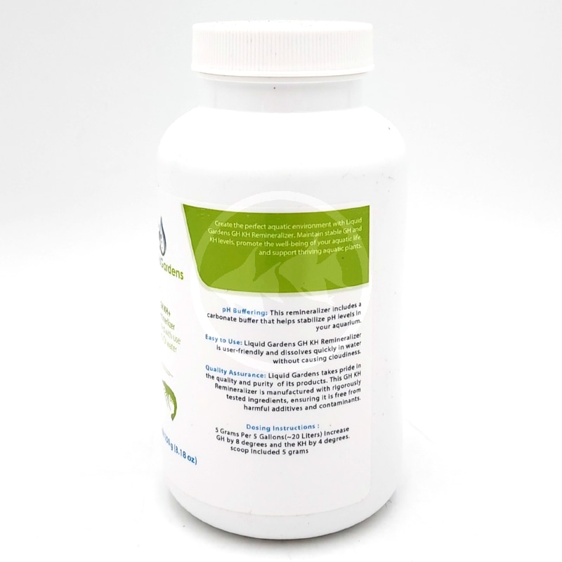 Liquid Gardens GH KH+ Remineralizer will raise the general hardness and carbon hardness of the water and is intended for use with RO/DI water. It contains Magnesium Sulfate, Potassium Sulfate, and Calcium Sulfate in a 1:3:3 ratio. Create the perfect aquatic environment for your shrimp and aquatic plants!