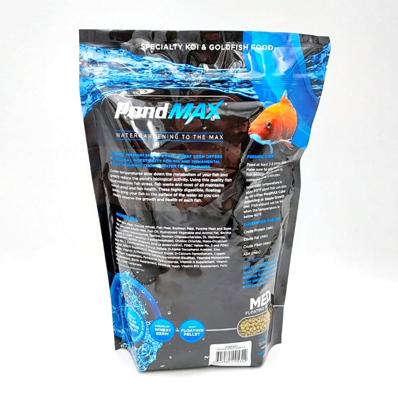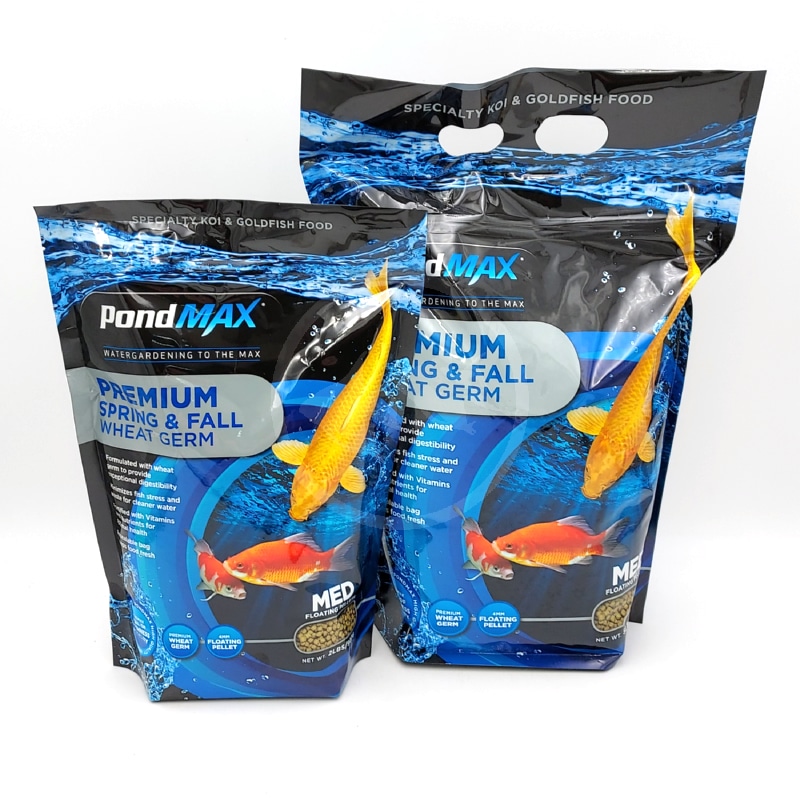 PondMAX Premium Spring & Fall Wheat Germ Koi and Goldfish food is a complete and nutritionally balanced diet. Formulated with quality ingredients to help optimize the growth of your fish and maintain your clear water with minimal waste.