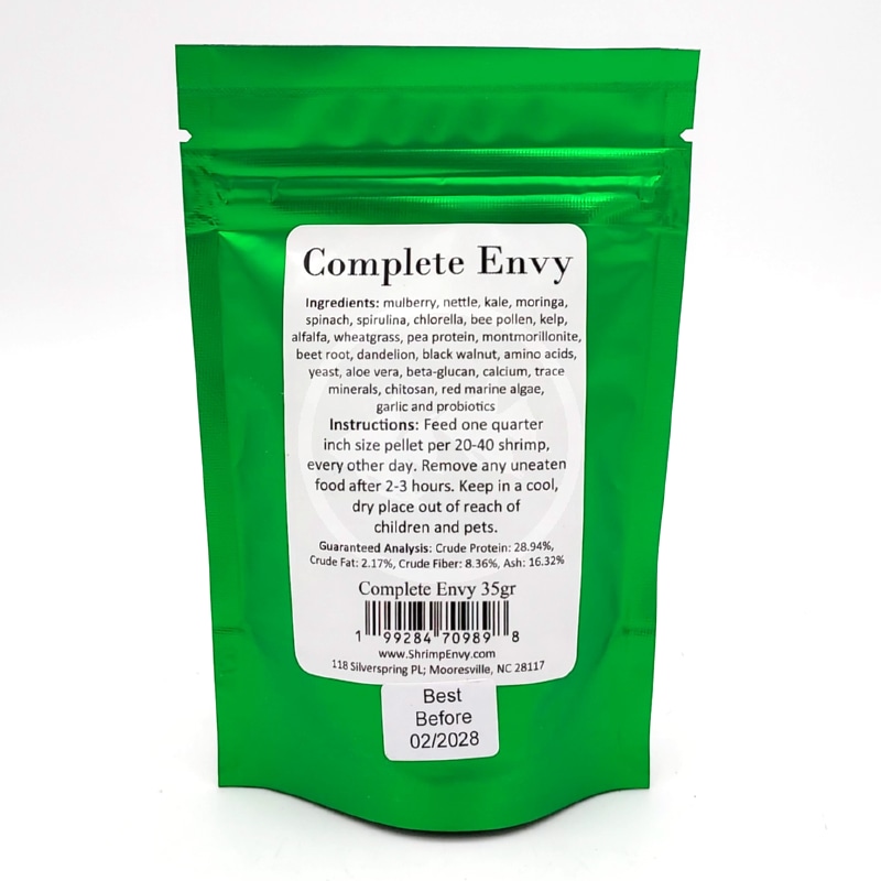Complete Envy Shrimp Food is a complete shrimp food. It contains 100% natural ingredients that your shrimp will love! This is a wholesome blend of mulberry, stinging nettle, dandelion, moringa, kale, spinach, spirulina, chlorella, bee pollen, kelp, alfalfa, wheatgrass, pea protein, aloe vera, beetroot, black walnut, and Garlic. There are also important nutrients and minerals such as beta-glucan, calcium, montmorillonite, amino acids, trace minerals, chitin, yeast, and probiotics.