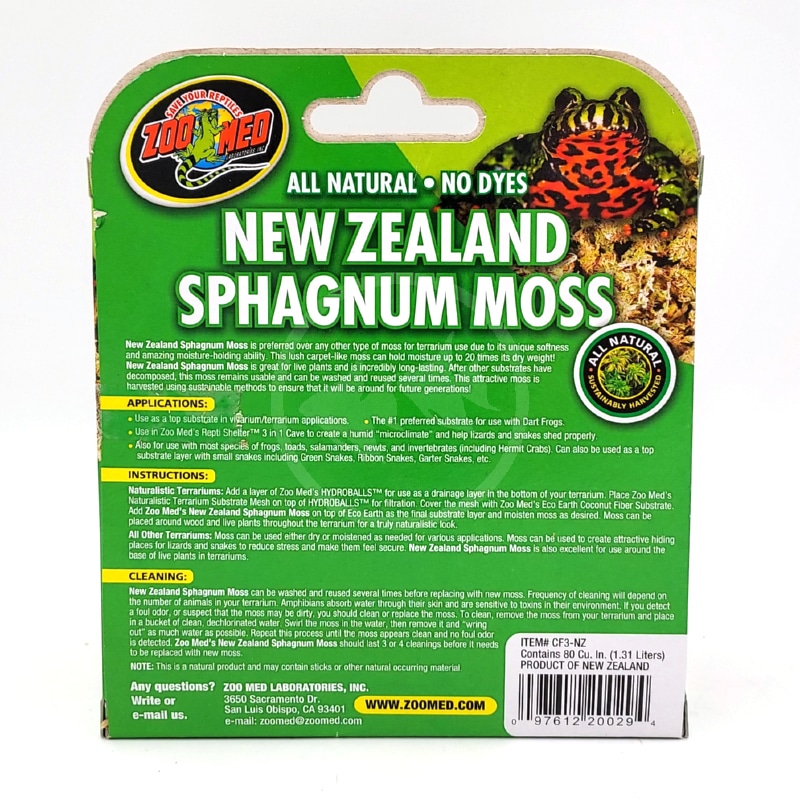 Zoo Med’s New Zealand Sphagnum Moss is preferred over any other type of moss for terrarium use due to its unique softness and amazing moisture-holding ability. This lush, carpet-like moss can hold moisture up to 20 times its dry weight!