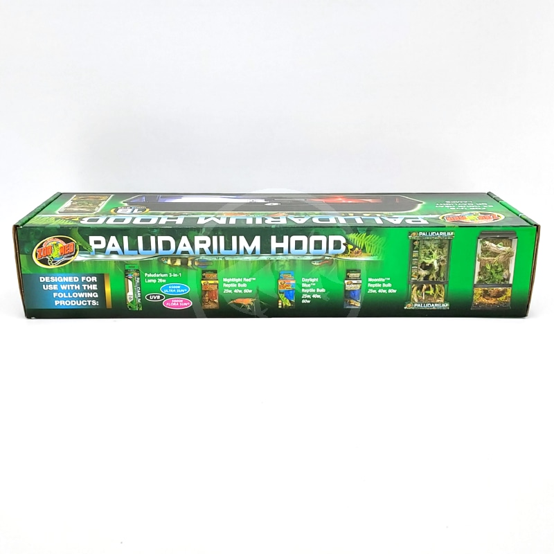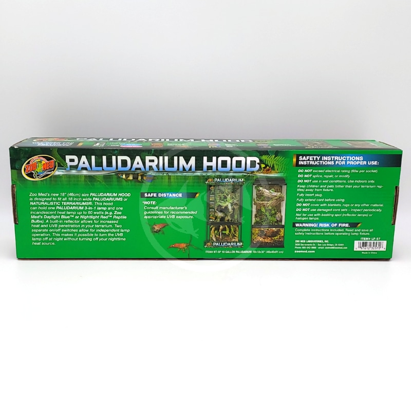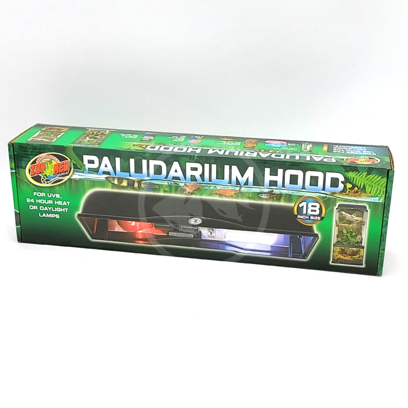 Zoo Med’s new 18″ (46cm) size PALUDARIUM HOOD is designed to fit all 18 inch wide PALUDARIUMS or NATURALISTIC TERRARIUMS®. This hood can hold one PALUDARIUM 3-in-1 lamp and one incandescent heat lamp up to 60 watts (e.g. Zoo Med’s Daylight Blue™ or Nightlight Red™ Reptile Bulbs). A built-in reflector allows for increased heat and UVB penetration in your terrarium. Two separate on/off switches allow for independent lamp operation. This makes it possible to turn the UVB lamp off at night without turning off your nighttime heat source.